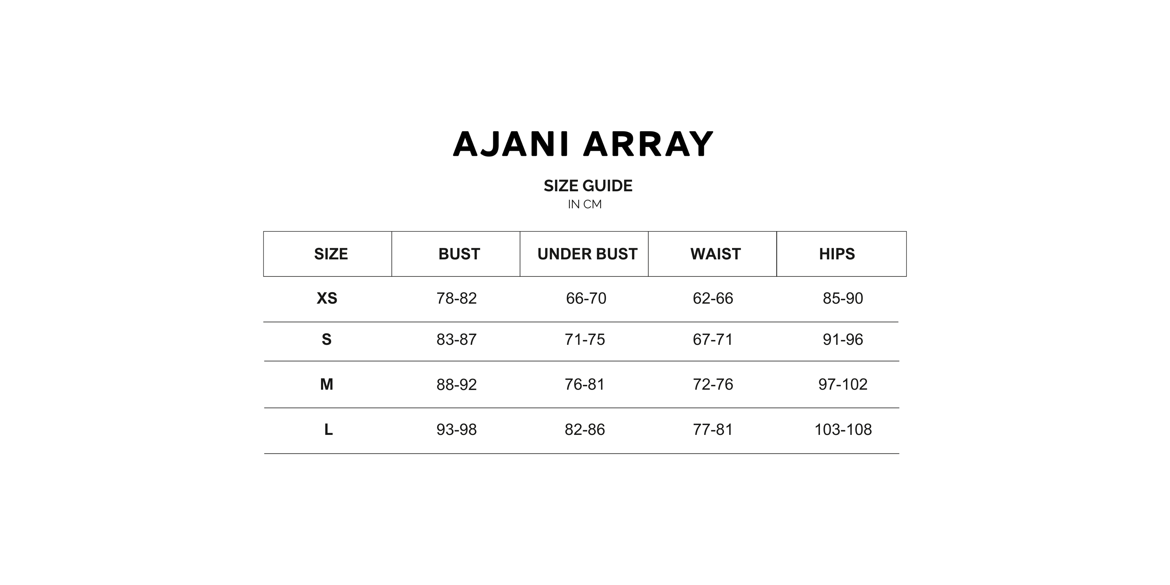 At AJANI ARRAY, we want to ensure that you find the perfect fit for every piece in our collection. To help you choose the right size, we've created a detailed sizing chart available below in centimeters. It's important to note that sizes may vary slightly between different designs due to the specific style and fit intended.